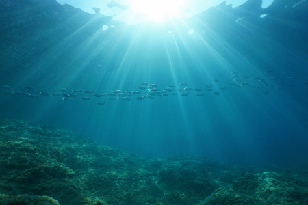 地中海海藻岩の海底から見た水面から水中日光自然の情景 カタルーニャ スペインのコスタ ブラバ の写真素材 画像素材 Image